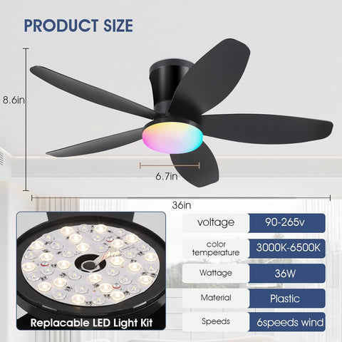 Flush Mount RGB Ceiling Fans with Lights-36 Low Profile Ceiling Fan with Light and Remote/APP Control,DC Reversible,LED Dimmable Black Ceiling Fans for Bedroom,Indoor/Outdoor Patio Use A101-B0F8HW8P6S