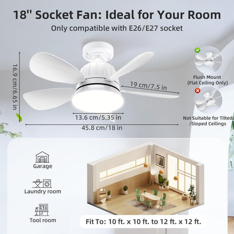 2-in-1 Ceiling Fan with Light: Maximize comfort and style with the socket fan light, which combines a high-performance fan and energy-efficient LED lighting in one unit. Designed to fit rooms from 10 ft. x 10 ft. to 12 ft. x 12 ft., itÕs the perfect solution for small to medium-sized spaces. The contemporary design enhances any room, dining room, laundry room, kitchen, garage, offices, closet, farmhouse, bedrooms, living room & more. Enjoy both cooling airflow and bright illumination, all while saving space and energy.