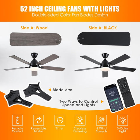 Ceiling Fans with Lights, 52 Inch Low Profile Ceiling Fan with Light and Remote Control,Reversible, 3CCT, Dimmable, Quiet, Black Ceiling Fan for Bedroom Indoor/Outdoor Use A101-B0D8BBWFL3