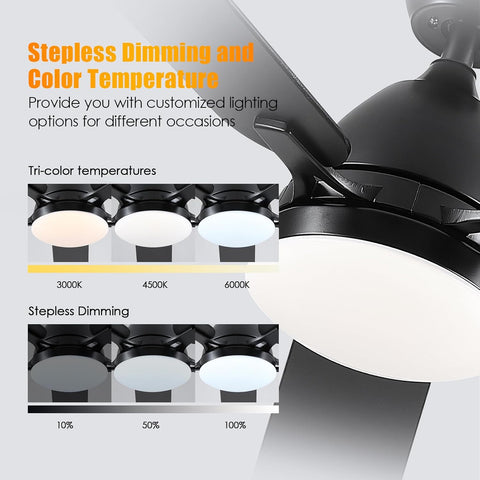 Our ceiling fans with lights come with both remote control and APP control, allowing you to effortlessly adjust the fan speed, three-color dimming, dimmable, applicable voltage: 110V-265V, night light mode, equipped with two 4-inch and 8-inch booms for easy selection of your appropriate heights, experience the convenience of modern technology at your fingertips.