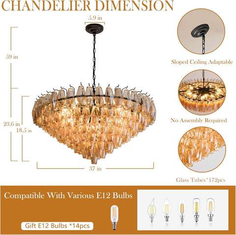 The round chandelier D37". With 172 pcs smoke glass tubes include 14pcs E12 bulbs. Cable adjustable height: up to 59 inches (150cm), equipped with convenient cable locks for quick suspension height adjustment, suitable for flat, sloped and vaulted ceilings.