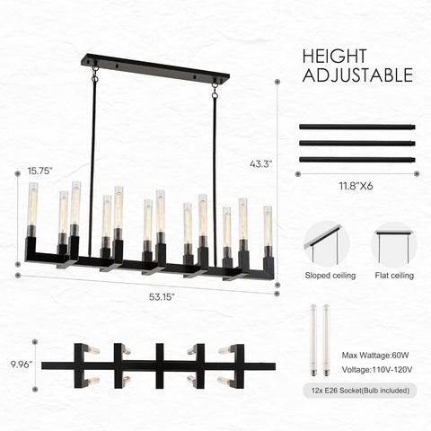54-inch Linear Dining Room Pendant Light Fixture with Glass Tube,Black Rectangular 12-Lights Industrial Kitchen Island Lighting Over Table(Included E26 Bulbs) A114-B0F1FDB52L
