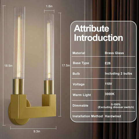This 19 inch modern brass wall sconce chandelier is made of brass, exquisite and durable, high quality pure copper finish ensures long-lasting luster, rust and corrosion resistant; it features a clear striped glass tube shade and includes 2 E26 compatible bulbs, which can be used in conjunction with a dimmer for dimming function, softly diffusing the light and creating a cozy dining table home atmosphere.