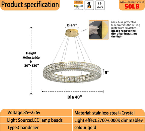 Ring Chandelier Size Diameter: 40''; Flush mount canopy: dia 8''. Maximum Hanging: Height Adjustable from 20'' to 120''. The cable length and crystal ring shape can be adjusted. Sturdy in construction and durable for daily use. Ideal for sloped/low/Middle layer. Perfect for Living Room, Bedroom, Dining Room, Kitchen, Bathroom, Foyer, Hallway, Office, etc.Please ensure dimensions of this crystal chandeliers is fit for your prepared space or not.