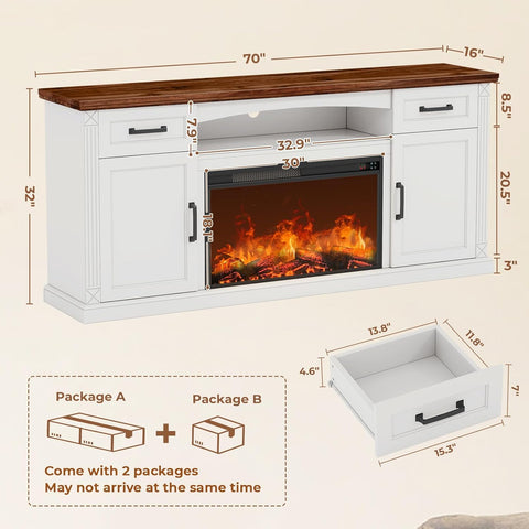 70 Inch Fireplace TV Stand for TVs up to 80 Inches, Farmhouse Entertainment Center with Electric Fireplace, Storage Drawers, White
