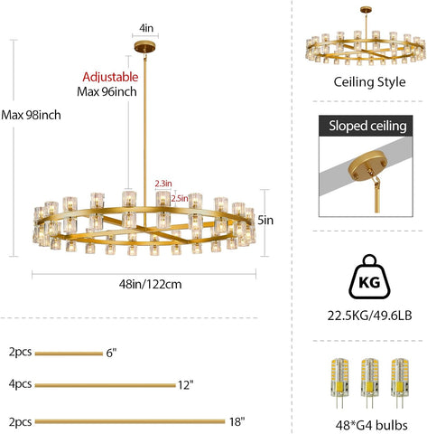 The overall diameter of the gold round crystal chandelier is 48 inches. Minimum installation height is 6 inches (the height from the ceiling to the crystal lampshade); maximum installation height is 96 inches. Please note the total weight of the chandeliers for the dining room is about 49.6 pounds. Please make sure your home ceiling meets the requirements before purchasing.