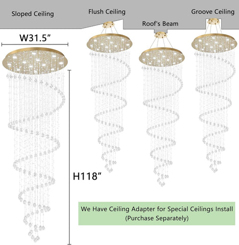 Spiral Raindrop Glam Chandelier - Whole length is 118". Canopy W31.4" x H2". Weight 39.6 lbs. Thickened finished stainless steel ceiling base plus K9 crystal. Chandelier height is not adjustable, please confirm the size before purchase.