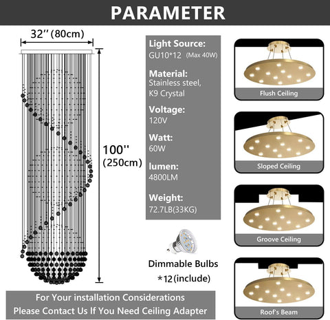 High Ceiling Foyer Chandelier - AC110-240V, each bulb is 5W LED, MAX 60W, chandelier total watte is 60W, 4800Lumen. High ceiling chandelier brightness light illuminate Villa, living room, foyer, hallway, entrance, hall, hotel, lobby, staircase