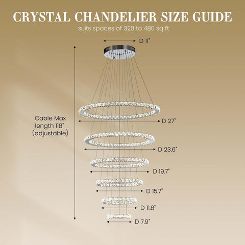 6 rings (D8"-D12"-D16"-D20"-D24"-D28"); Cable length Max 118"/300cm (Adjustable). The crystal chandelier weighs 27.25 pounds and is perfect for installing over dining tables, kitchen islands and dining rooms, also suitable for living rooms, bedrooms, hallways, hotels, staircases, duplex staircases, foyers, offices, villa pickets, lobbies and more. Supports single ring or multi-ring combination hanging to achieve free switching between commercial and home scenes.