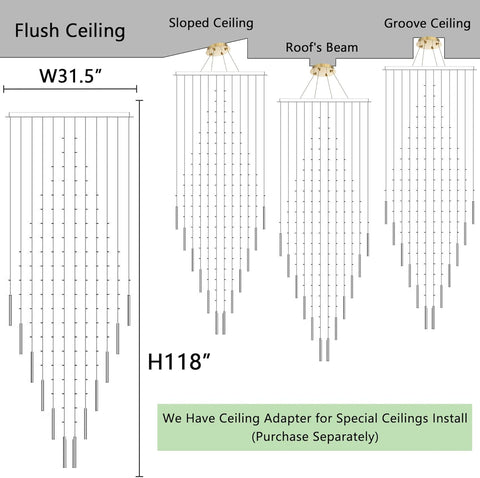 Gorgeous Crystal Raindrop Chandeliers - Canopy width 32 in. whole light height 120 in. Applicable voltage AC110V-240V, include 12pcs dimmable GU10 led bulbs, whole light is 60W, 4800 lumens