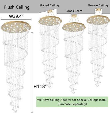 Spiral Raindrop Glam Chandelier - Whole length is 118". Canopy W39.3" x H2". Weight 72.7 lbs. Thickened finished stainless steel ceiling base plus K9 crystal. Chandelier height is not adjustable, please confirm the size before purchase.