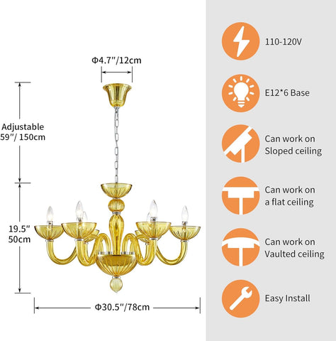 Measuring 20" in height and 33" in width, this light fixture comes with an adjustable chain that extends up to 59" and a canopy Diameter of 4.7in/12cm. It requires 6x E12 bulbs to illuminate any room with a warm and welcoming glow.