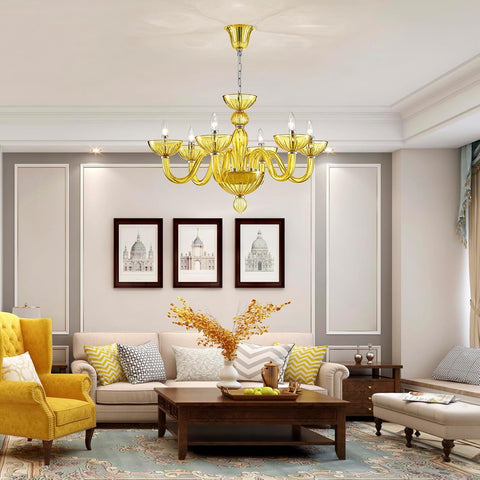 Add a touch of glamour and sophistication to any space with this exquisite yellow crystal chandelier. It features elegantly curved glass arms, full of modern elements.