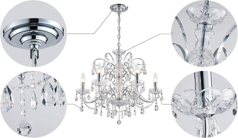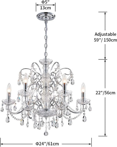 Fixture Dimension for this crystal chandelier light is Height 22 inches x Diameter 24 inches. The MAX 60 inches adjustable chain is perfect for proper height installation.