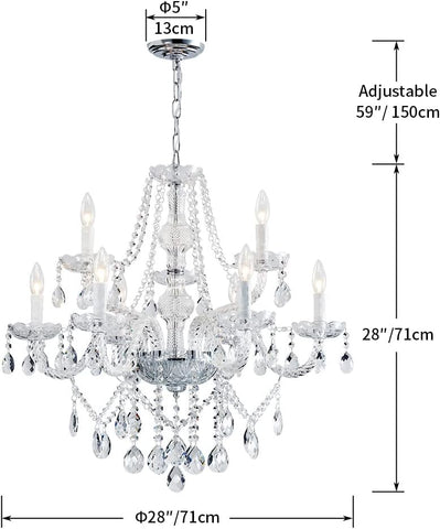 Minimalist contemporary Style to creat atmosphere. Money Guaranteed for Satisfaction. Fixture Dimension: Height 28in, Width 28in. Material: Glass Fixture & Crystal droplets. Easy to Install & Fittings and Ceiling Plate included,Full Assembly Required with time and effort.