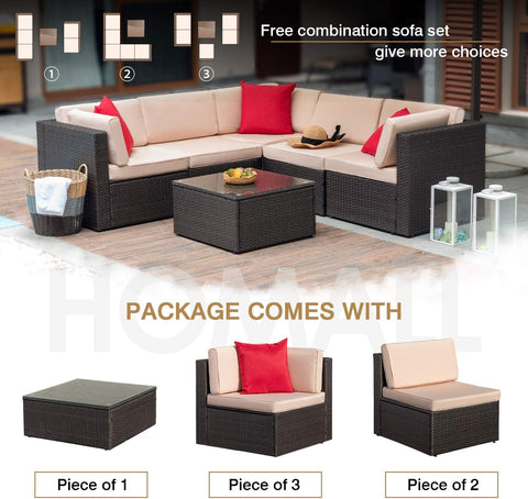 6 Pieces Set Includes - This patio sofa set comes with 3 corner sofa, 2 x armless sofas, 1 x coffee table with 1 x tempered glass top, 13 x cushions and 3 red pillows (Assembly Required)(Tips:Cushions and pillows are not waterproof, please put a cover on your sofa in rainy days)