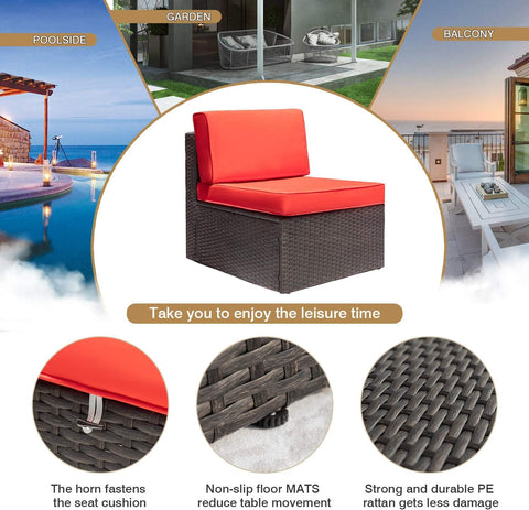 6 Pieces Set Includes - This patio sofa set comes with 3 corner sofas, 2 armless sofas, 1 coffee table with 1 tempered glass top, 13 cushions, and 3 red pillows. (Assembly Required) (Cushions and pillows are not waterproof; please put a cover on your sofa on rainy days.)