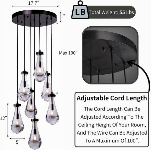 Raindrop Pendant Lights Kitchen Island Teardrop Black Hanging Light Fixtures Clear Solid Glass Pendant Light Modern Chandeliers for Dining Room Porch Corridor Living Room (7-Light) A121-B0CJF34NBX