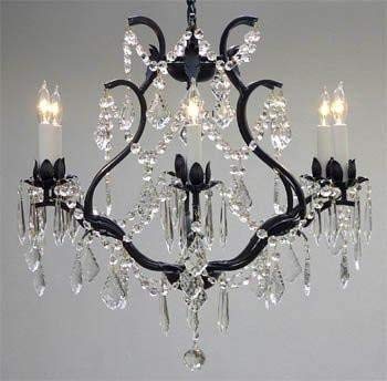 A Great European Tradition. Nothing is quite as elegant as the fine crystal chandeliers that gave sparkle to brilliant evenings at palaces and manor houses across Europe. This beautifully unique version from the Maria Theresa Collection has 100% Crystals that capture and brilliantly reflect the light of the candle bulbs which sit in a leaf design bobache. The frame is all hand-forged wrought iron, adding the finishing touch to a wonderful fixture. The timeless elegance of this chandelier is sure to lend a special atmosphere anywhere its placed! SIZE: H.19" W.20" 6 LIGHTS.Assembly Required.