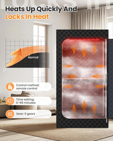 Complete heating in few minutes! The powerful XL steamer and 360¡ steam head provide rapid and even heat, allowing the steam to be distributed throughout the sauna tent. The steam pot has 9 temperature Settings, with a maximum working time of 99 minutes. It is also equipped with remote control, sit and enjoy steam sauna!