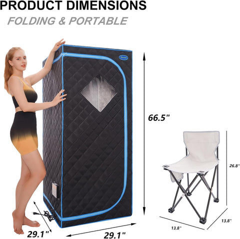Full size portable sauna: 29.1*29.1*66.5 inches, with a detachable frame for easy folding and storage. The portable sauna includes heated foot MATS, folding chairs and wired remote controls. Help you enjoy the sauna experience at home.