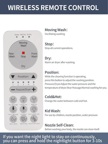 - Multi-Function Intelligent Control: Electric bidet seat with warm water washing, heated seat, warm air drying, multiple wash modes (rear, front, oscillating), nozzle self-cleaning, and sterilization for enhanced comfort and convenience.