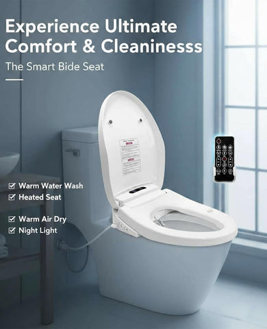 Elongated Smart Heated Bidet Toilet Seat with Slow-Close Lid, Warm Air Dryer, Remote Control, LED Light, Adjustable Temperature