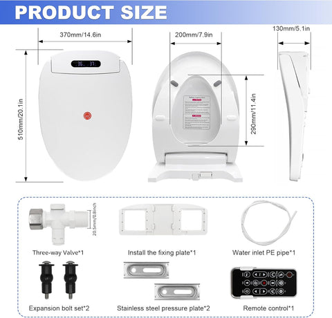 - Easy to install, this elongated toilet seat measures 20.1'' x 14.6'' x 5.1'' and can be installed in just 5 minutes. It comes with a leak-proof electrical protection switch for utmost safety.