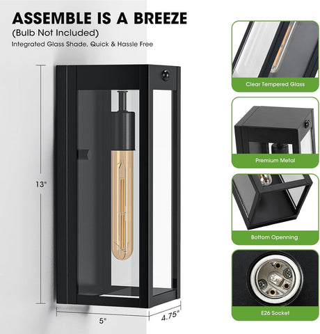 These black exterior lights have an integrated style that requires no assembly and is easy to install. The glass shade comes pre-installed; just connect the wires and use two screws to fix the wall lamp on the wall. The uncover-bottom design of these exterior wall sconces makes it extremely simple to replace bulbs from the bottom without any tools or stripping it down. The package contains porch lights, mounting hardware, and an instruction manual.