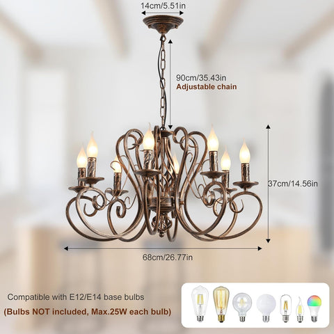 Farmhouse 8 Lights Chandeliers: 8 candle-shaped bulb stems with dish cups, placed on 8 simply curved iron arms.Use crafted durable metal frame, bronze add retro appearance to it,the candle bulbs can offers vintage and rustic element,bring you back to mid-century. It can be widely use for farmhouse, barn, country etc, ideal for kitchen island, dining room table, living room, bedroom,little house, hallway space. this vintage chandelier can complete your rooms decor.