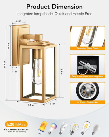 Gold Outdoor Wall Lights, Waterproof Outside Porch Lights, Anti-Rust Porch Lights Outdoor, Outside Light Fixture for House, Garage, Doorway, Garden, Tempered Glass, E26 Socket A123-B0CY2FW5ZZ