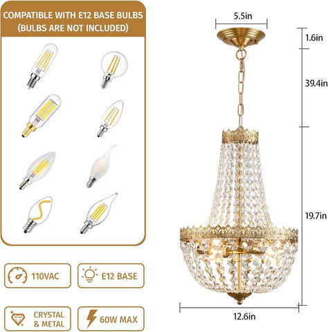Bulb Compatibility: This retro small crystal beaded chandelier light fixture need 4xE12 Light bulbs(bulb is not included).It is compatible with LED,incandescent,CFL and halogen bulbs,dimmable with compatible dimmer switch and bulbs (not included).It also can be equipped with bulbs of different color temperatures(60W Max).