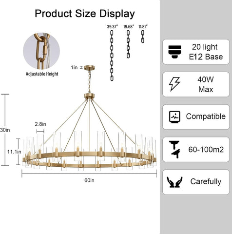 Farmhouse chandelier measures 34 inches (H) x 60 inches (D). Gold pendant light uses 20 E12 bulbs (not included). Works with incandescent, LED, CFL, CFL, incandescent, halogen, and vintage Edison bulbs (up to 60 watts).