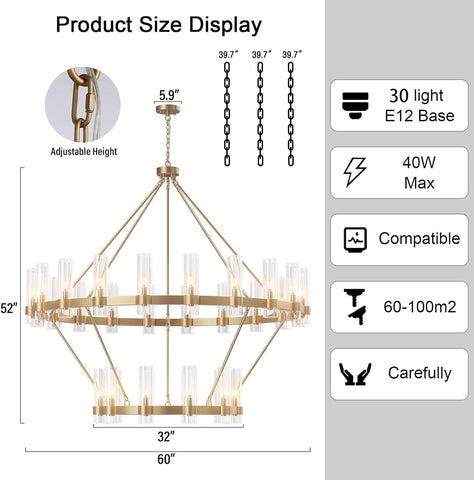 Farmhouse chandelier measures 52 inches (H) x 60 inches (D). Gold pendant light uses 30 E12 bulbs (not included). Works with incandescent, LED, CFL, CFL, incandescent, halogen, and vintage Edison bulbs (up to 60 watts).
