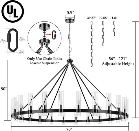 70 Inch Black Wagon Wheel Chandelier with Glass Shade, 24 Lights, Modern Farmhouse Style, Ideal for Dining Room, Kitchen, Entryways A115-B0CHF7PP6Z