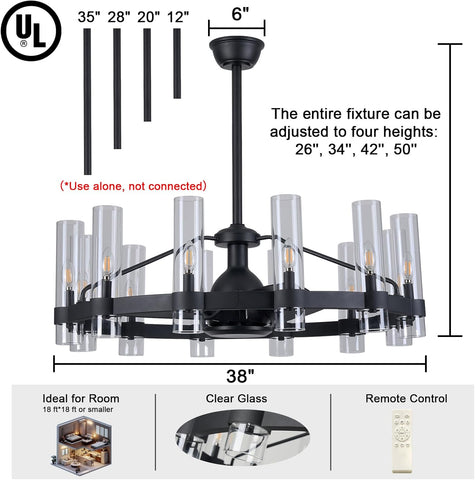 Black Ceiling Fans with 12 Lights Wagon Wheel Chandelier, 38 Inch Modern Farmhouse Fandelier, Quiet 6-Speed Reversible DC Motor, 1/2/4H Remote Timing for Living Room/Bedroom/Kitchen A115-B0F5M79C12