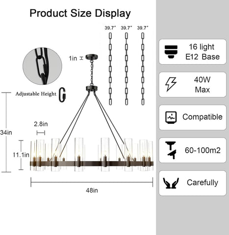 Farmhouse chandelier measures 34 inches (H) x 48.03 inches (D). Black pendant light uses 16 E12 bulbs (not included). Works with incandescent, LED, CFL, CFL, incandescent, halogen, and vintage Edison bulbs (up to 60 watts).