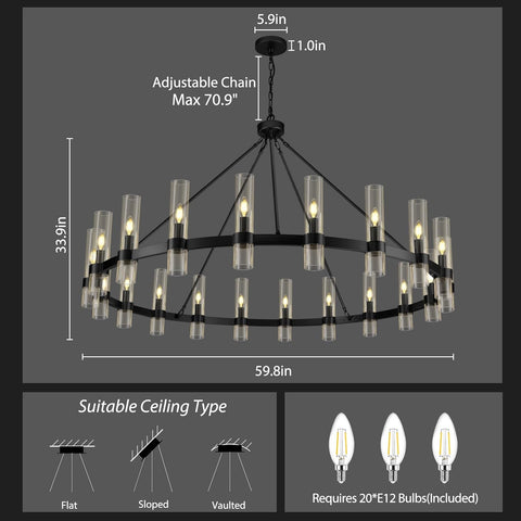 Includes bulbs.This black round chandelier has a diameter of 60 inches, a glass height of 12 inches, a diameter of 2.5 inches. The maximum hanging height is 83 inches. Adjustable hanging heights are available within the dimensions