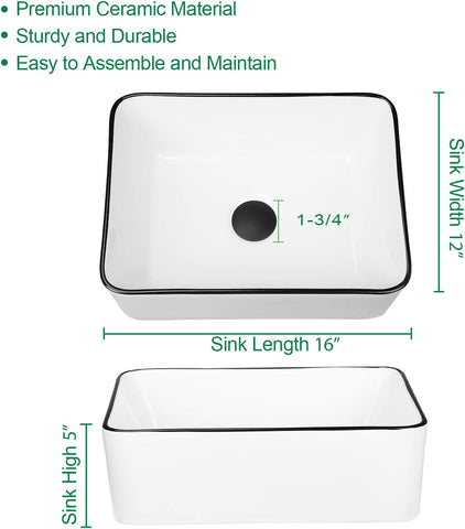 Ceramic Rectangular Bathroom Vessel Sink, 16'' x 12'' Above Counter Porcelain Small Sink with Faucet Combo, White Body with Black Trim on The Top A131-B08S47Q9NQ