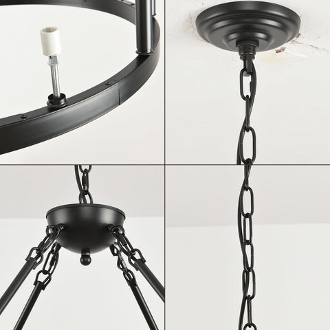 The black wagon wheel chandelier was made by a skilled craftsman. The 12-light design provides 360¡light coverage creating a vintage industrial style and a nostalgic style. If you use a bright bulb, it will illuminate a large space,creates a cozy home atmosphere.