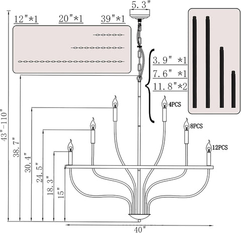 This Black Chandelier Fixture Features A Unique Three-Section Chain And Four-Section Boom. The Three Sections Of Chain Measure 12 Inches, 20 Inches And 39 Inches In Length. The Total Chain Length Is 71 Inches. The Four-Section Boom Measures 12", 12", 8" And 4" In Length. Overall Boom Length Is 36 Inches. Flexible Height Adjustment As Needed.