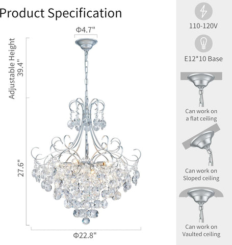 Dimensions The modern chandelier diameter 22.8 in x Height 27.6 in, Ceiling Plate Dimensions Diameter 4.7 inch x Height 2 inch, with Adjustable Hanging Chain, max Length is 39.4 in.